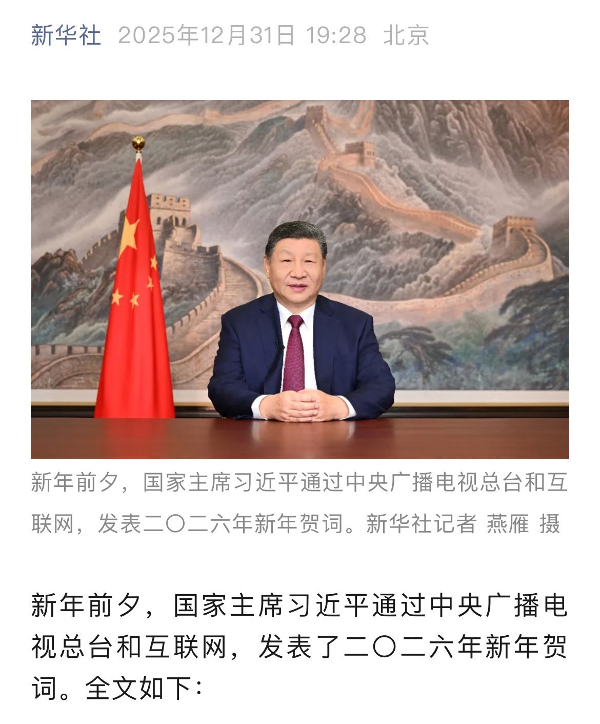 国家主席习近平发表二〇二六年新年贺词