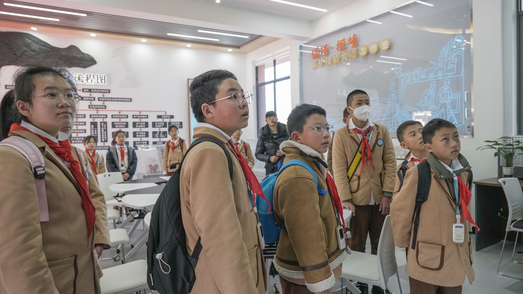 在采矿、选矿、冶金、材料等大师工作室,仿真模型与精巧设备牢牢锁住孩子们的目光。“地砖和门柜锁为啥是‘工’字形?”“灯带像流动的锡水!”带着满心好奇聆听讲解时,孩子们眼中满是憧憬。