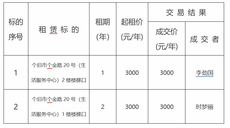 一、租赁标的交易结果: