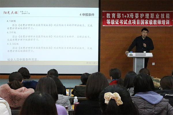 为贯彻落实国家和辽宁省职业教育改革实施方案精神,根据《教育部等四部门印发< 关于在院校实施“学历证书+若干职业技能等级证书”制度试点方案>的通知》、《教育部教师工作司关于组织开展1+X证书制度试点院校教师培训的通知》等文件要求,11月21日,由辽宁省教育厅主办,BB贝博艾弗森官方网站作为牵头院校承办的母婴护理专业辽宁省国培计划“1+X证书”制度试点院校教师培训班开班典礼在医疗护理分院隆重举行。学院党委委员、医疗护理分院院长李冬,教务处处长王新,医疗护理分院副院长姚文山、郭强,济南阳光大姐服务有限责任公司“1+X”证书项目负责人李凯主任出席了开班典礼,李冬院长在开班典礼上做开班动员。本次培训历时7天,共有来自全省20家兄弟院校的59名学员参加培训,学院特邀相关领域6位专家进行授课。