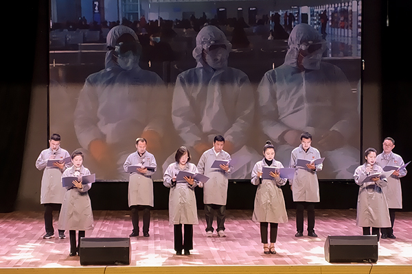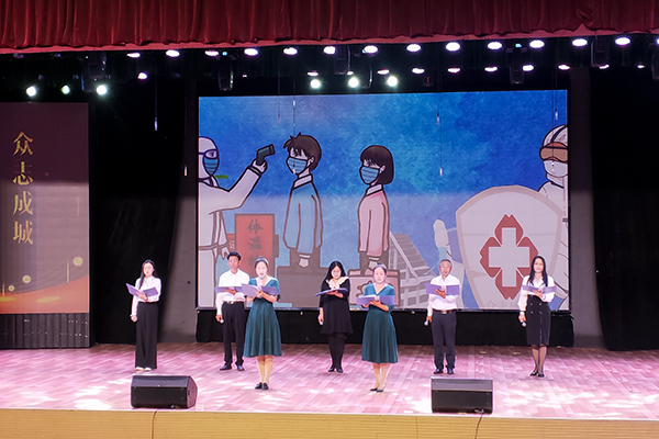 此次诗歌朗诵会以抗击疫情为主题,学院教职工通过荡气回肠的叙事之诗、激昂奋进的战斗之诗、催人泪下的温暖之诗,充分表达了对“最美逆行者”的敬意,歌颂了伟大抗疫精神,展现了中国人民众志成城,共克时艰的团结伟力。虽然本次演出观众席上空无一人,但并未影响参演人员的表演热情。整场演出主题突出、内容丰富。