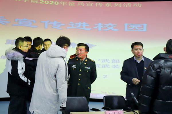 为全面落实习近平强军思想,建设世界一流军队,为国防建设输送高素质人才,积极做好学院2020年大学生征兵工作,1月2日17时,学院武装工作部在博远楼103会议室与大洼区人民武装部联合开展了征兵宣传进校园政策宣讲活动。大洼区人民武装部政委刘宏宇、参谋刘爽、干事林涛等一行人到学院进行宣讲,学院武装工作部军事教研室主任王俊杰,学院机电工程系、化学工程系及其他院系男生同学近300人参加了宣讲会。
