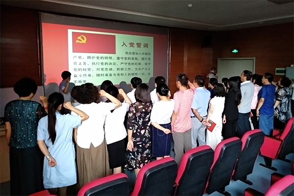 最后,全体党员一同面对党旗举拳宣誓,重温入党誓词。