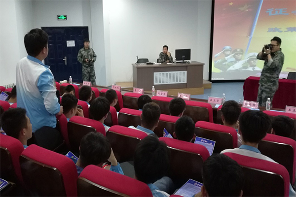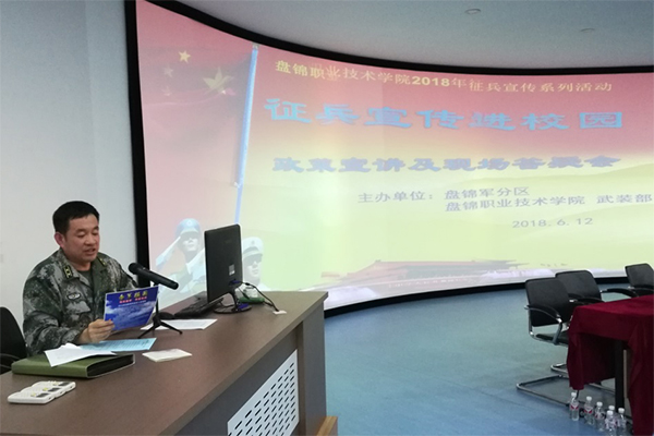 “优秀青年励志从军,热血男儿精忠报国”。为全面贯彻落实2018年全国大学生征兵网络视频会议和辽宁省政府征兵办、辽宁省教育厅下发的《关于做好2018年高校大学生征兵工作的通知》文件精神,扎实有效做好我院2018年大学生征兵工作,6月12日下午BB贝博艾弗森官方网站武装工作部与盘锦军分区共同开展“BB贝博艾弗森官方网站2018年大学生征兵宣传进校园政策宣讲及现场答疑会”活动。盘锦市委常委、军分区司令员张庆国同志,副司令员吕立爱同志, 辽东湾新区党工委副书记王锦华,大洼区人武部政治委员刘宏宇,学院党委书记王正东,党委副书记(武装工作部部长)李兵,学生工作处处长(武装工作部副部长)邓红伟及盘锦军分区、辽东湾新区党工委、大洼区人武部、学院武装工作部、学生工作处、各分院系的领导、辅导员老师和200余名同学参加了会议。学院党委副书记(武装工作部部长)李兵主持了此次会议。