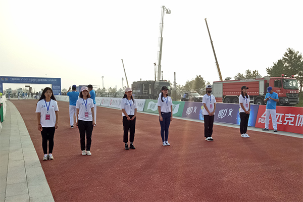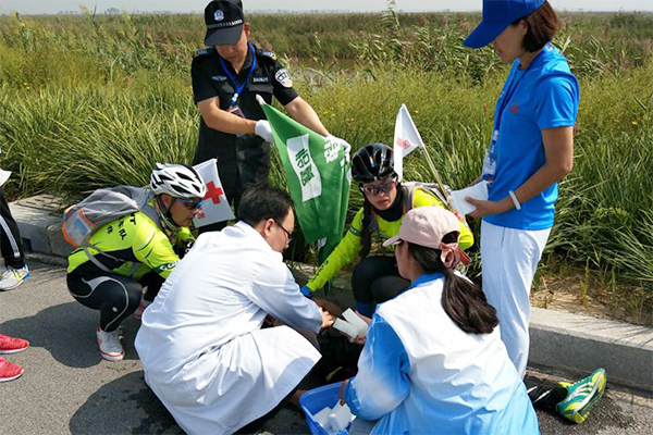 9月1日下午,志愿者开展赛前实战演练。青年志愿者身着整齐的运动服,不顾高温日晒,接受2017盘锦红海滩马拉松赛的医疗志愿者、裁判志愿者以及安保志愿者的业务培训。