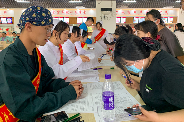 献血现场,参与献血的学生在医护人员和志愿者的引导下,按照疫情防控期间团体献血的有关要求,做好各项防护措施,有序地进行登记、体检、测量血压、测血型等程序,并认真听取医护人员讲解献血前后的注意事项,献血活动有序进行。