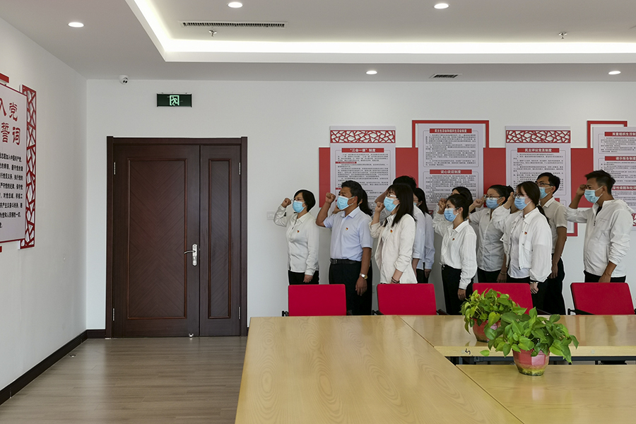 党日活动的第一项是参观学习市党群服务中心党史馆。在专业工作人员的讲解、指导下,全体同志进行了参观学习,温习了党的发展史知识,了解了盘锦市近年来的党建成果,拓展了党建工作视野,激发了前行动力,接受了一次深刻的党性教育。参观结束后,贺丽娜书记作为领誓人,带领支部党员重温入党誓词。面对鲜红的党旗,同志们一起高举右手,再次庄严宣誓。铿锵恢宏的誓词,强烈震撼着在场的每一位党员,一字一句,神圣而豪迈,体现了党员同志们对中国共产党的无限忠诚。为了表达对党的热爱,张阔、罗浩、高睿希、陈艺坤四位教师现在表演了诗朗诵《党旗颂》。