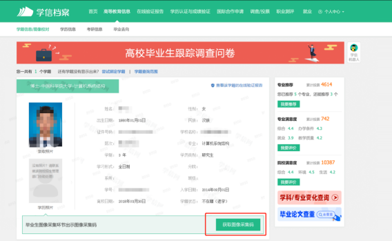 全日制学生的采集码在毕业前一年的1月1日之后生成可下载。成人教育学生的采集码在毕业注册后生成可下载。有效期1年。
