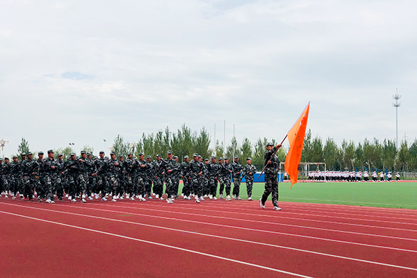 2019-09-15九月的盘锦,气候宜人,9月12日上午10:00,学院2019级新生军训成果汇报表演大会在学院操场举行。学院党委副书记、武装工作部部长李兵,学生工作处、武装工作部副部长邓红伟,武警机...