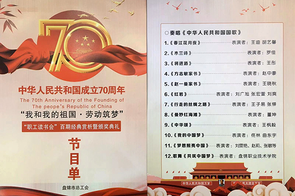 2020-01-02为热烈庆祝新中国成立70周年,扎实推进“服务振兴发展、服务职工群众”工作,组织广大教职工开展好“我和我的祖国•劳动筑梦”系列宣传活动,在广大职工中掀起读书热潮,盘锦市总工...