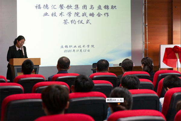 2020-11-2311月13日14:00,学院与盘锦福德汇餐饮集团在学院图书馆二楼举行战略合作签约仪式。福德汇餐饮管理有限公司总经理辛亚萍、人力资源总监陈涛、人力资源部高级经理马艳、福德汇辽河民俗...