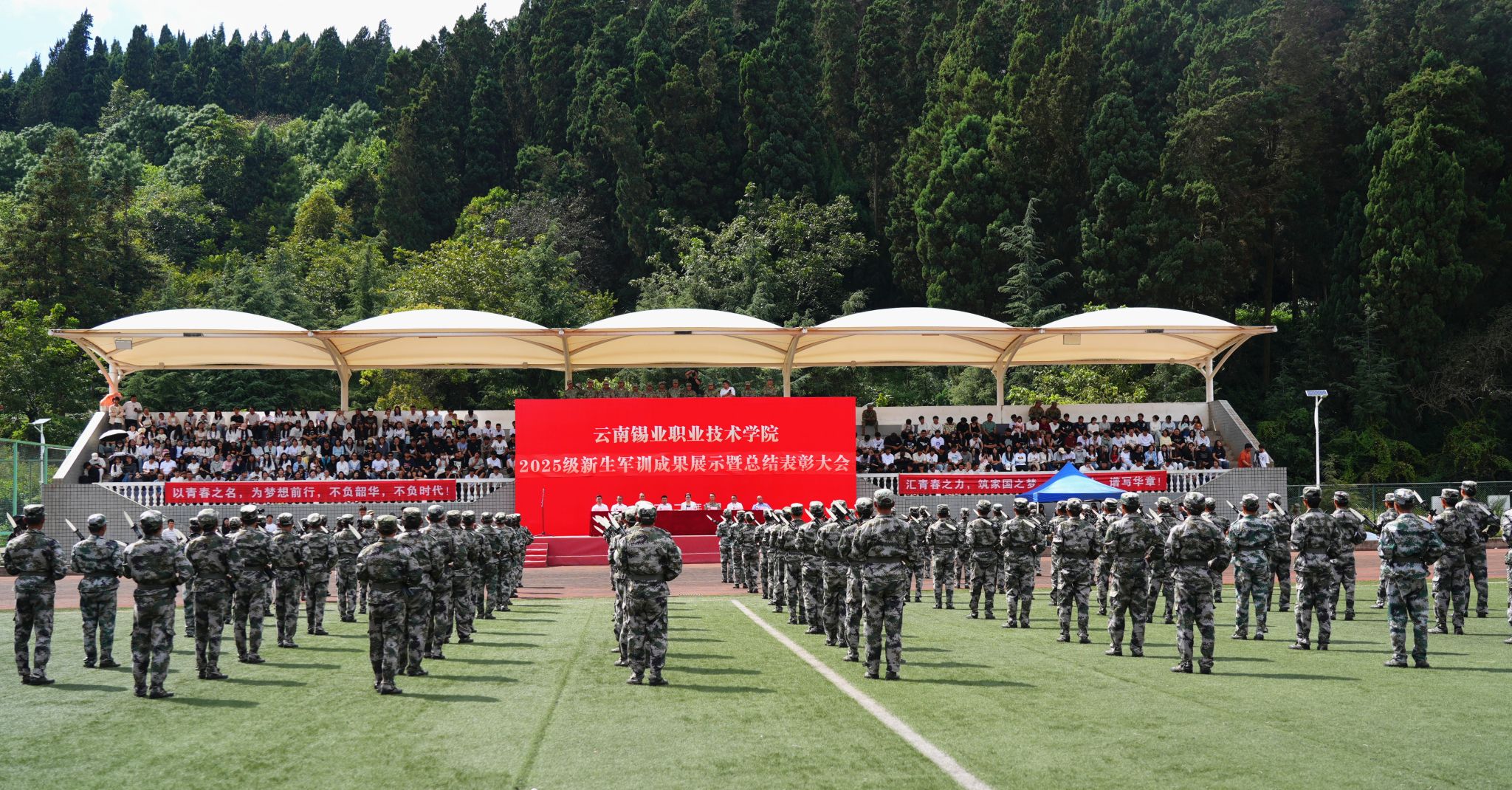 9月20日,学院举行2025级新生军训成果展示暨总结表彰大会。个旧市武装部部长王东虎、学院领导班子、全体承训教官及2100余名参训新生齐聚现场,共观训练成果。学院党委副书记、院长李蕾在讲话中寄语新生:一要将军训中锤炼的品德作风融入学习,转化为优良学风;二要规范日常行为,严守学院纪律规矩,从身边小事做起,不断超越自我;三要铭记教官教诲,“不抛弃、不放弃”,以坚韧直面挫折,奋力书写无愧自己的青春华章。“全体都有—...