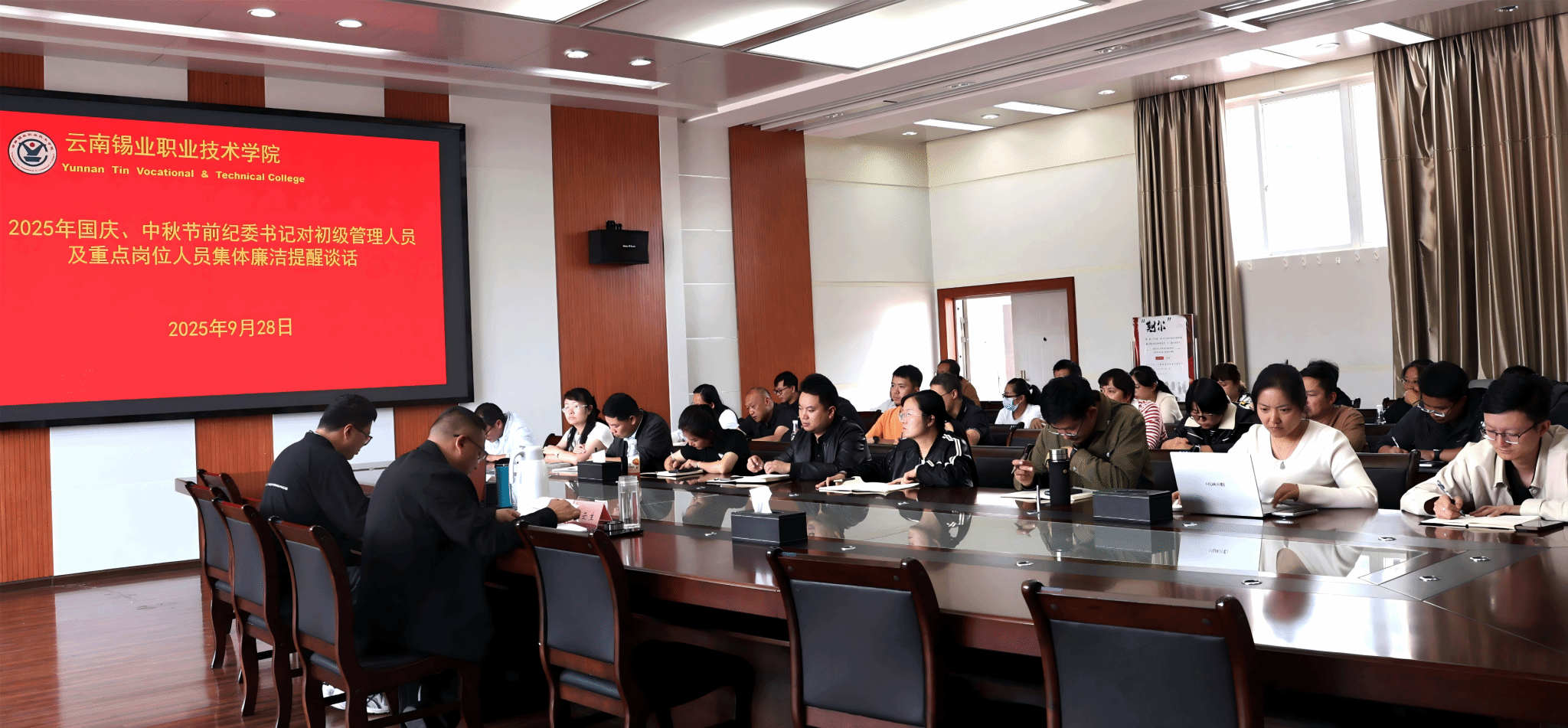 中秋、国庆双节将至,为深入贯彻落实全面从严治党要求,进一步严明纪律规矩,营造风清气正的节日氛围。9月28日,学院纪委书记张云生以集体谈话的形式对全体初级管理人员及重点岗位人员开展节前廉洁提醒谈话。张云生强调,一要绷紧“思想弦”,时刻保持警惕,切勿把“客气”当“福气”、“小事”当“无事”、“放松”当“放纵”,防微杜渐,绝不能因恶小而为之;二要量准“行动尺”,坚决拒收礼品礼金、果断拒绝违规请托、审慎应对特殊场合邀请,...