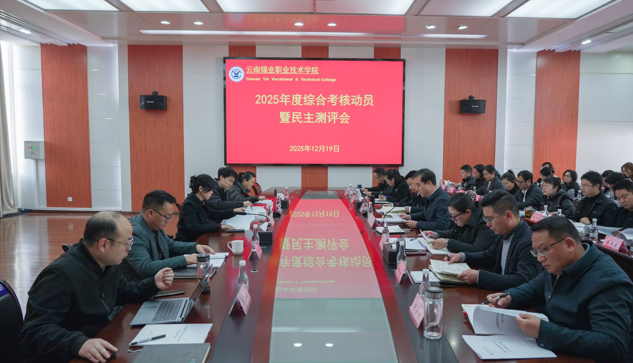 12月19日,控股公司纪委书记、驻云锡监察专员、第六考核组组长兰菊带队到学院开展2025年度综合考核评价。学院党委书记俞鑫主持综合考核动员暨民主测评会议。
